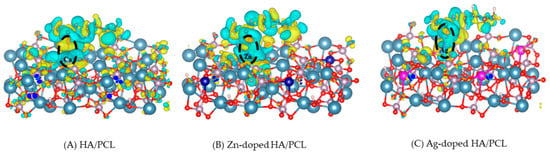 Among the HOMOs and LUMOs of pure HA, Zn-doped HA, and Ag-doped HA (Figure 7), we found that Ag-doped HA has more LUMOs on Ag atoms, which indicates a relatively strong electrophilicity of the Ag atoms. Ag-doped HA has the strongest bonding with the carbonyl O atom of PCL, which results in a maximum adsorption energy.