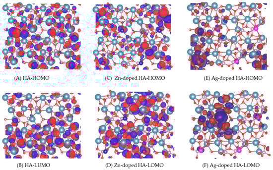 HOMOs and LUMOs of HA, Zn-doped HA, and Ag-doped HA.