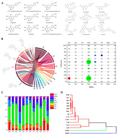 The PMF content in sour orange. (A) The structures and the names of flavonoid standards used in this study. (B,C) The absolute and relative content of PMFs in sour orange. (D) Clustering analysis of Citrus taxa based on PMF content.