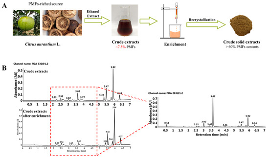 Purification of PMFs in sour orange. (A) The experimental design of the purification of PMFs in sour oranges. (B) UPLC chromatograms of PMFs before and after purification.