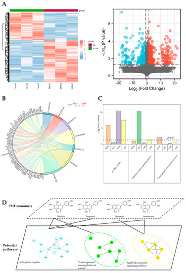 The potential targets of PMFs were downloaded from online databases SWISS and SEA. The downloaded targets were merged and duplicates were removed, followed by GO/KEGG enrichment using ggplot2 and GOplot packages. The protein–protein interaction (PPI) network was established by STRING and modified by Cytoscape Version 3.8.2 (National Institute of General Medical Sciences, USA).