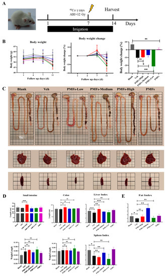 The protective effects of PMFs on irradiation-induced injury. (A) Experimental design. (B) Body weight change of mice during the experiment. (C) Major intraperitoneal organs of differently treated mice. (D) Organ indexes of mice. (E) Fat mass index of mice. * p < 0.05; ** p < 0.01; *** p < 0.001. ns, not significant.