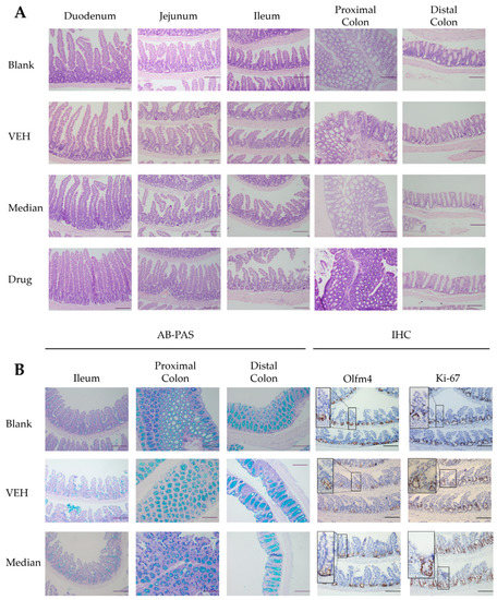 Staining of pathological sections. (A) H&E staining. (B). AB-PAS staining and IHC staining of Olfm 4 and Ki-67.