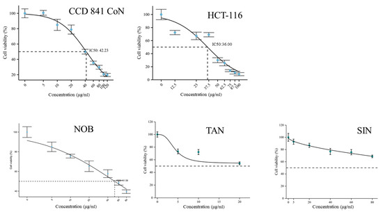 Cytotoxicity of PMFs was tested through a CCK8 method. Two cell lines, CCD 841 CoN (normal colonic epithelium cell line) and HCT-116 (colorectal cancer cell line), were used to determine the influences of PMFs on cell viability. As PMFs started to crystalize in complete medium at a concentration of 100–120 μg/mL, concentration gradient of PMFs was set as 0, 5, 10, 20, 40, 60, 80, 100 and 120 μg/mL. The IC50 values of PMFs in CCD 841 CoN and HCT-116 were 42.23 μg/mL and 36.00 μg/mL, respectively. The cytotoxicity of three major monomers in sour orange PMFs was also tested using cell line CCD 841 CoN. Nobiletin was shown to crystalize in complete medium at 198 μM (80 μg/mL), and the IC50 was calculated as 128.18 μM (51.58 μg/mL). The crystallization concentrations of tangeretin and sinensetin were 53 μM (20 μg/mL) and 214 μM (80 μg/mL). The inhibition of cell viability brought by tangeretin and sinensetin was no more than 50% under their saturated concentration (Figure 6).