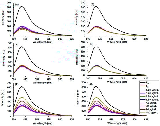 Leakage-induced fluorescence emission spectra of calcein, encapsulated in the GUV, after interaction with various concentrations of (A) curcumin-loaded succinylated pea protein, (B) curcumin-loaded native pea protein, (C) curcumin-loaded succinylated pea protein-chitosan, (D) curcumin-loaded native pea protein-chitosan, (E) hollow succinylated pea protein-chitosan, and (F) hollow native pea protein-chitosan complexes.