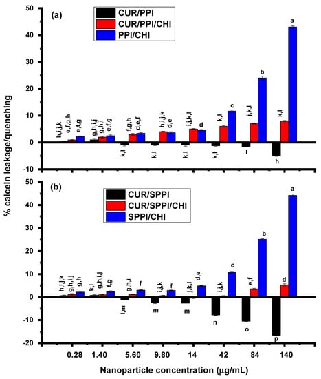 Hollow PPI/CHI and SPPI/CHI nanoparticles showed dose-dependent significant leakage within the tested concentrations. As with the curcumin-loaded protein and protein-chitosan pairs, PPI/CHI and SPPI/CHI nanoparticles displayed similar modes of interaction. There was no significant difference in the leakage effect observed at nanoparticle concentrations of 0.28 to 14 µg/mL. However, major leakage of more than 40% was noted at a nanoparticle concentration of 140 µg/mL (Figure 2). This effect could be attributed to nanoparticle-induced membrane perturbation. Single-walled carbon nanotubes, functionalized with lysozyme from chicken egg white, demonstrated similar dose-dependent leakage of calcein from liposomes, attaining ~30% leakage at a particle concentration of 80 ng/mL. The leakage effect of PPI/CHI and SPPI/CHI hollow could be because of the low stability of the nanoparticles, as demonstrated from their low binding constants (data not shown). The irregular nanostructure of PPI/CHI and SPPI/CHI, coupled with their numerous pores in solution, could also be contributing to the leakage. Pores have been reported to considerably impact membrane integrity [19,27]. Pore-forming toxins employ similar mechanisms to form holes in biomembranes, leading to the death of target cells [28]. Our previous study showed that curcumin encapsulation is essential for the stability of the protein-chitosan complex [1]. The shape of nanoparticles plays an important role in their membrane disruption ability. For instance, one-dimensional shape of single-walled carbon nanotube, coated with lysozyme, was reported to be responsible for liposome disruption [12].