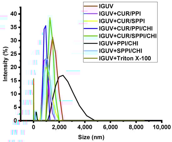 Dynamic light scattering size distribution curve of calcein-loaded giant unilamellar vesicles (lGUV), before and after interaction with hollow (PPI/CHI and SPPI/CHI) and curcumin-loaded protein nanoparticles (CUR/PPI, CUR/SPPI, CUR/PPI/CHI and CUR/SPPI/CHI) and Triton X-100.