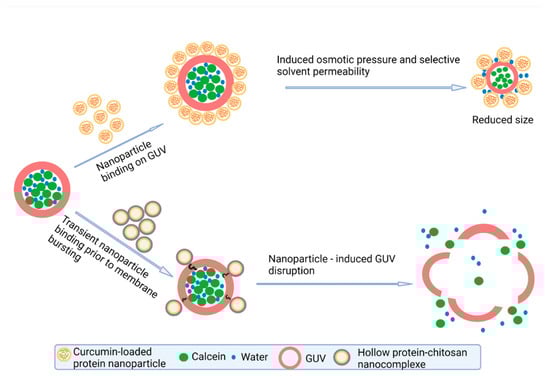 The images from confocal and widefield microscopy further corroborate the findings. The morphology of the GUV, after interaction with CUR/SPPI, CUR/PPI, CUR/SPPI/CHI, and CUR/PPI/CHI nano-complexes (Figure 4a–d and Figure S1c–f), looks similar to that of the calcein-loaded GUV in the absence of the nanoparticles (Figure 4g and Figure S1b). This suggests minimal impact of the nanoparticles to the biomembrane. The size range of the nanoparticles < 200 nm [1] falls outside the range of the light microscope, making it difficult to capture the nanoparticles on the surface of the GUV, as postulated for CUR/SPPI and CUR/PPI, or in the vicinity of the GUV for CUR/SPPI/CHI and CUR/PPI/CHI nano-complexes. Figure 4e,f and Supplementary Figure S1g,h confirmed membrane disruption and calcein leakage induced by the hollow SPPI/CHI and PPI/CHI nanocomplexes, with impact more visible in SPPI/CHI. The morphology of the empty GUVs (Figure 4i and Figure S1a) indicates that calcein encapsulation stabilizes the vesicles, thus giving it a definite structure. Taken together, the calcein leakage and microscopy results show two distinct nanoparticle-GUV interaction mechanisms, as illustrated in Figure 5.