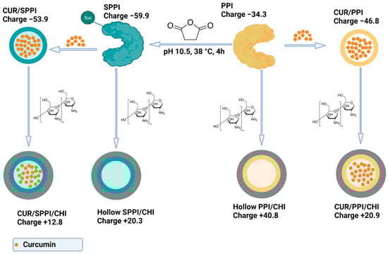 Pea protein isolate (PPI) with total protein content of 96.1%, as determined from Lowry assay, was extracted from yellow pea seeds (Pisum sativum) by the isoelectric precipitation technique and succinylated with succinic anhydride at pH 10.5 and a temperature of 38 °C, as previously reported. Detailed protocol is provided in Sections S1.1 and S1.2 of the Supplementary Information. Hollow and curcumin-loaded protein and protein-chitosan complexes were prepared with the native (PPI) and succinylated pea protein isolates (SPPI), as briefly described in Scheme 1; detailed experimental procedures are presented in Section 3.2.1, Section 3.2.2, Section 3.2.3 and Section 3.2.4.