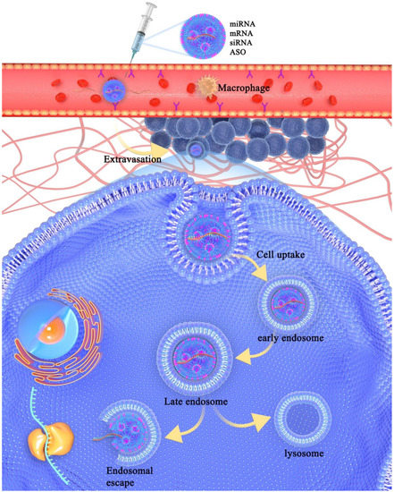 Though genetic agents have shown their clinical practice, delivering these agents as part of gene therapy faces many challenges. Apart from production costs, nucleic acids can be degraded easily in plasma by nucleases or other components, which reduces the efficiency of gene delivery [46]. As the first barrier, the extracellular matrix (ECM), including the interstitial matrix and basement membrane, plays a significant role in gene transport [47,48,49]. The deposition of ECM makes tumor tissues denser than normal tissues [50,51], which leads to an increase in interstitial tissue pressure and subsequently causes difficulties to gene transport [52,53]. Moreover, nucleic acids without any protections can be degraded by ribonucleases (RNases) in plasma [54,55]. Exogenous vesicles are also easily cleared by macrophages and dendritic cells [56,57,58,59,60,61]. Actually, it is mentionable that the mononuclear phagocytic system (MPS) plays an important role in the non-specific clearance of foreign nucleic acids [56,62]. MPS consists of macrophages, neutrophils, dendritic cells, blood monocytes, and granulocytes. It exists in many tissues, such as the liver, spleen, lymph nodes, and lung [63,64]. MPS can eliminate recognized exogenous materials from biological environments. Other extracellular barriers include excessive superfluous vasculature, vascular endothelial cells, and high interstitial fluid pressure [49,65,66]. Another challenge is the intracellular barrier, affecting mainly the cellular uptake, which is a process of interaction between extracellular materials and cell membrane. There are various pathways involved in cellular uptake, including macropinocytosis [67,68], clathrin-dependent endocytosis [69,70,71,72], caveolin-dependent endocytosis [73,74], and other clathrin/caveolin-independent endocytoses [75]. Once vesicles are endocytosed by the cells, they will be trapped by the endosome (Figure 1).