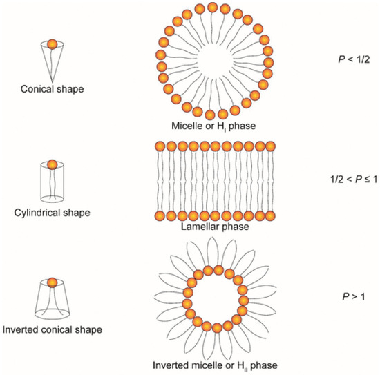 Phospholipids are one of the most important components of the cell membrane, which consists of a hydrophilic phosphate head group, a glycerol bridge, and two hydrophobic fatty acid tails. Due to its amphiphilic characteristics, a lipid bilayer can be readily formed in the aqueous phase. On the basis of the modification of the head group, phospholipids can be divided into different subtypes, including phosphatidylcholine (PC), phosphatidylethanolamine (PE), phosphatidylserine (PS), phosphatidic acid (PA), phosphatidylinositol (PI), phosphatidylglycerol (PG), and cardiolipin (CL) [146]. Many researchers have reported that the saturation degree of lipids has an influence on the structure phase transition temperature (Tc). The more unsaturated lipids have a lower phase transition temperature that makes lipids transform from a lamellar phase to an inverted hexagonal phase, which contributes to an enhanced fusogenicity [147,148,149]. The highly saturated lipid chain causes a high Tc; for example, DSPC that contains two saturated fatty acid chains can form a cylindrical shape at room temperature, which enhances the stability and prolongs the circulation time. However, in some cases, it is hard to process drug release and endosomal escape due to less fusion with an anionic lipid membrane [150]. On the other hand, phospholipids such as 1,2-dioleoyl-sn-glycero-3-phosphocholine (DOPC) and 1,2-dioleoyl-sn-glycero-3-phosphoethanolamine (DOPE) with unsaturated fatty acid chains usually form inverted conical shapes at room temperature, and in this way the lipid nanoparticles containing these lipids are more likely to escape from the endosome. The alkyl chain length also has an effect on the physicochemical properties of LBNP. With the increase in the alkyl chain length, fewer drugs can be entrapped [151]. A long chain length can also enhance the stability of LBNP [152]. It is also mentioned that lipids with branched tails can strengthen the delivery efficiency of nucleic acids [153]. The head group is responsible for the pKa value, the charge, and the amphiphilicity of phospholipids. Lipids with head groups such as phosphatidylcholine and phosphatidylethanolamine show a neutral charge, while lipids with phosphatidylserine and phosphatidylglycerol are negatively charged at physiological pH conditions [154]. The structure of head groups and alkyl tails determine the geometry of lipids, including phospholipids, cationic lipids, and ionizable lipids together. Lipids can form different structural phases in aqueous solution, such as hexagonal phases, lamellar phases, or inverted hexagonal phases, which can be divided by a packing parameter (P) decided by the ratio of hydrocarbon volume (V), the area of the head group (a), and the critical length of lipid tails (lc). The equation is P = V/a*lc (Figure 3). Lipid-based nanoparticles containing lipids that adopt inverted hexagonal phases, such as DOPE, have better delivery efficiency since they can promote the lipid transition process from lamellar phase to non-lamellar phase and destabilize the structure of the endosomal membrane, which subsequently facilitates endosomal escape, and nucleic acids can be delivered to the cytosol [150,155,156].