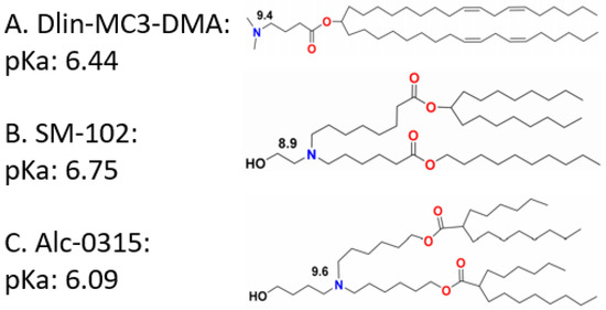 Structure and pKa value of DLin-MC3-DMA (A), SM-102 (B), and Alc-0315 (C). Copyright is reserved by 1996–2022 MDPI (Basel, Switzerland).