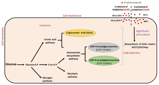 Insulin transports more D-xylose in cells; in noninsulin conditions, 50% of D-xylose is both in the plasma and inside the cell, while insulin shifts these proportions to 20% in the plasma and 80% in the cell (see Figure 1) [49]. Free D-xylose molecules significantly stimulate the biosynthesis of HS, CS, and DS [54,55,56,57,58]. Thus, insulin stimulates the biosynthesis of cell-layer GAGs, since it helps transport more D-xylose into the cell, which then stimulates the biosynthesis of GAGs, as confirmed by a previous study [59]. In addition, in 2009, Han et al. [60], in a study on changes in HS of endothelial cells in diabetes, showed that high glucose or insulin levels alone reduced endothelial GAGs, but the presence of both simultaneously, i.e., hyperglycaemia + insulin, preserved GAGs [60]. When both insulin and glucose levels are high, what happens to D-xylose? At high concentrations of insulin (in normal glucose levels), 80% of xylose is able to pass through the cell membrane, but this transport is competitively inhibited by glucose in situations of hyperglycaemia [61]. Thus, high insulin and glucose levels lead to a situation (level of D-xylose in the plasma) comparable to normal conditions without diabetes, as was demonstrated in vivo by Field and Johnson in 1960 [50], who reported the removal of D-xylose from the blood in nondiabetic patients, and no effect on the blood level of D-xylose in insulin-treated diabetic patients. The results from Han et al. [60] in 2009 are thus in line with the action of insulin on D-xylose.
