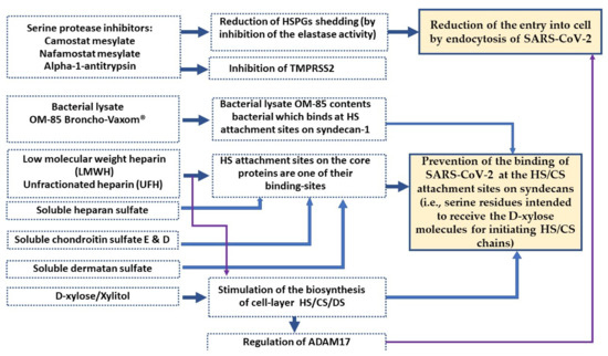The ectodomains of syndecans, which are the receptors of SARS-CoV-2, are also shed from the cell surface by a family of enzymes called A disintegrin and metalloprotease (ADAM). ADAM17 is a metalloprotease, the inhibition of which prevents the shedding of syndecan-1 and -4 [43]. We recently discussed why the entry into cells by the endocytosis of viruses that use core proteins as receptors could be the direct conse-quence of the renewable process of proteoglycans after their shedding from the cell surface [5]. We also summarised studies that showed that HS chains maintained on the core protein inhibit metalloproteinase enzymes and thus inhibit their shedding from the cell surface, which thereby reduces the endocytosis (See Section 5) entry of viruses attached to core proteins [5]. In consequence, ADAM17 inhibition could have protective effects on COVID-19 patients [32,33].