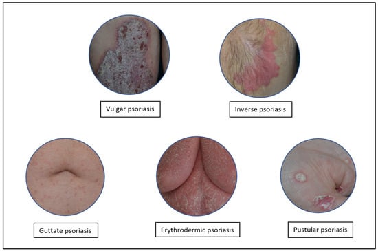 Psoriasis is one of the most common chronic inflammatory skin diseases that affects about ~2%–3% of the worldwide adult population [1,2]. Psoriasis affects both males and females, without prevalence of gender [3], and its clinical lesions start to appear between 20 and 30 years of age, although children and adolescents may also be affected [4]. This pathology can be classified into several forms: Psoriasis vulgaris, P. guttata, P. pustolosa, P. erythrodermica, and P. inversa [5] (Figure 1).