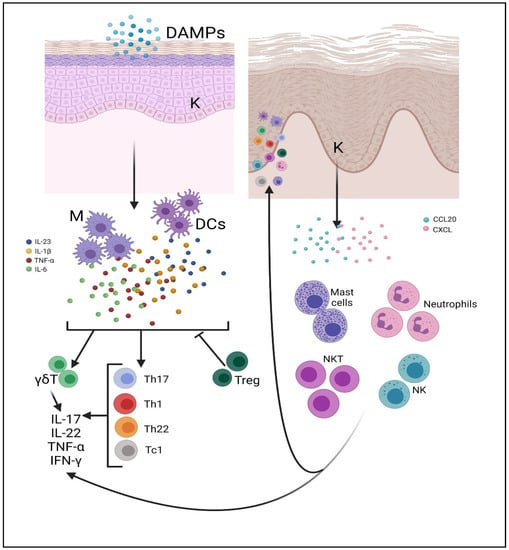 The pathogenetic mechanism of psoriasis. DAMPs activate DCs and macrophages by inducing the secretion of IL-23, IL-1β, IL-6, and TNF-α. They stimulate the TCD4+ (Th1, Th17, Th22) and CD8+ (Tc1)-mediated immune response. Mast cells, neutrophils, NK and NKT cells, and other immune cells infiltrate the site of phlogosis in the skin, contributing to disease progression by releasing IL-17 and antimicrobial peptides. Treg cells lose their suppressive activity and, in some cases, convert to Th17 cells, further increasing the local inflammatory reaction. Cytokines and chemokines act on keratinocytes, inducing their hyperproliferation. Activated keratinocytes produce CCL20 and CXCL1, 3, 8, 11, increasing cell infiltration. This creates an amplified continuous cycle that leads to injury. Abbreviations: M, macrophages; K, keratinocytes. Created with BioRender.com (accessed on 18 February 2022).