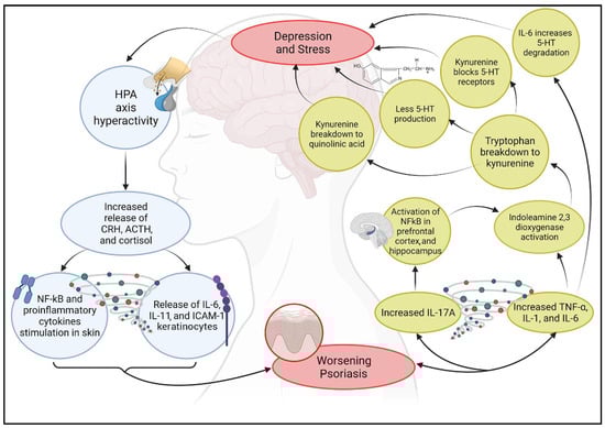 Several studies have demonstrated a correlation between psoriasis and depression [143]. Kurd et al. (2010) examined the clinical reports of almost 1 million subjects, aimed to determine the incidence of levels of anxiety, suicide risk, and depression in both patients with psoriasis and the rest of the population [144]. The results suggest that psoriatic patients have a higher risk of developing depression [145] and anxiety and are at a higher risk of committing suicide, especially young and male patients, as well as having greater comorbidities with other psychiatric disorders [144]. Furthermore, several studies suggest that depressed patients show a 30% higher production of proinflammatory cytokines, such as IL-1β, TNF-α, and C-reactive protein (CRP) [146,147], which affect the metabolism of some neurotransmitters (such as dopamine, serotonin, and glutamate), neuroendocrine function, and even neuroplasticity, resulting in neurotoxicity and neuronal apoptosis [148,149]. This production of cytokines can play an important role in both the aggravation of psoriasis and depression, confirming the link between the immune and neuroendocrine system and human behavior, which is altered in these cases [146,150,151]. A mechanism that elicits the onset of depression and at the same time chronic inflammation in patients with psoriasis is the hyperactivity of the HPA axis, resulting in the release of increased levels of CRH, ACTH, and cortisol and in a stimulation of the transcription factor NF-kB and of the proinflammatory cytokines in the skin [152]. CRH stimulates the proinflammatory cytokines IL-6 and IL-11 as well as the expression of the intracellular adhesion molecule-1 (ICAM-1) of keratinocytes, which promotes the migration of immune cells and facilitates cell-mediated immune responses [153]. In addition, dysfunction of cortisol receptors (mineralocorticoids and glucocorticoids) downstream from the HPA axis reduces the sensitivity of the anti-inflammatory effects of cortisol since the body is unable to skillfully regulate corticosteroid levels (Figure 4) [154]. Recently, the role of Th17 cells in depression has been investigated [155]. Several studies found that these cells were augmented in the blood of depressed patients [156]. Patients with psoriasis who show high levels of cytokines, Th17 cells and IL-17A, are more subjected to develop depression and anxiety disorders [144]. These data suggest a strong correlation between depression and the immune system; therefore, a relationship between depression and psoriasis may be hypothesized [157]: depression improvement might be observed following treatment of psoriasis, and conversely, depression treatment might improve psoriasis symptoms [157].