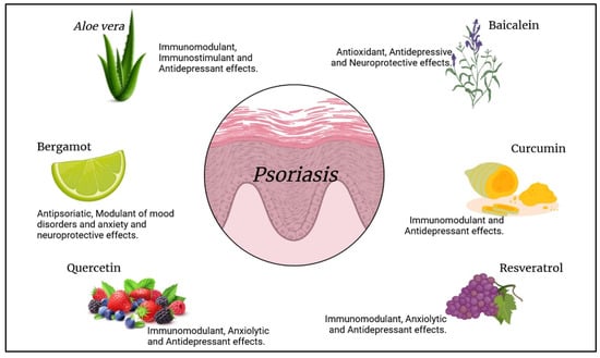 Quercetin, well known for its antioxidant and anti-inflammatory activity [198], can induce apoptosis through ROS generation [199] and can support keratinocyte-growth inhibition induced by arsenic trioxide [200]. A study by Mestry et al. (2020) evaluated the beneficial effect of a gel based on quercetin combined with Commiphora mukul in the treatment of psoriasis [201]. Moreover, on the one hand, quercetin decreased TNF-α, IL-6, and IL-17 levels, modulating the inflammatory state in psoriasis [202], and on the other hand, it is also involved in the management of cholinergic and serotonergic functions, producing an anxiolytic and antidepressant effect and enhancing memory performance [203]. A recent study has confirmed that quercetin significantly reduces anxiety behaviors in mice subjected to mild traumatic brain injury and regulates ACTH and corticosterone levels in the HPA axis, enhancing depressive states [204].