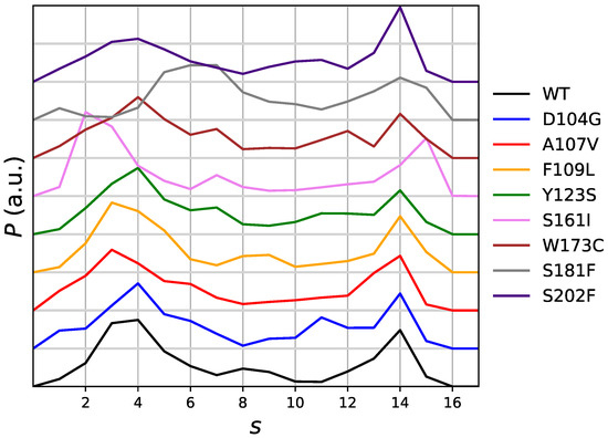 The free energy as a function of the average of the chosen collective variable is displayed in Figure S1 (Supplementary Materials). Each panel is for a given protein sequence. Top panel is for the native wild-type (WT) sequence. In all functions, the zero of free energy is set to = 14. We assume that in all cases the native-like folded state is the most stable and the value of s = 14 is sampled in meta-statistics for all sequences with similar weight (Figure 2). The stability of the native state has been shown by the experimental characterization (CD spectra) along with temperature, with the exception of W173C [15].