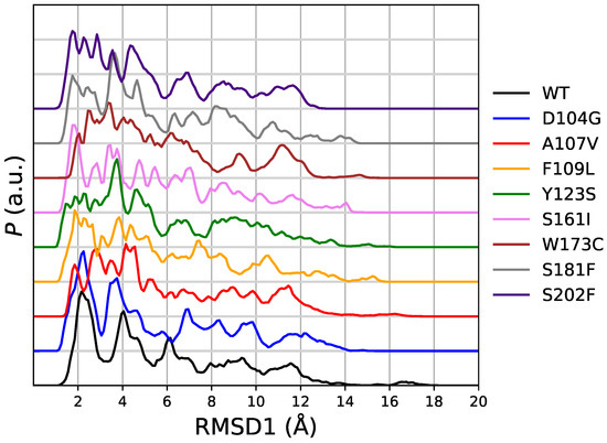Distribution of collective variable in the meta-statistics (Equation (2)). Variants are ordered according to increasing mutated residue number. From bottom to top: WT, D104G, A107V, F109L, Y123S, S161I, W173C, S181F, S202F.