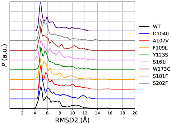 Distribution of root-mean square deviation with respect to PDB 5KZ5 (RMSD2) obtained in meta-statistics for all studied variants. The order is the same as for Figure 2.
