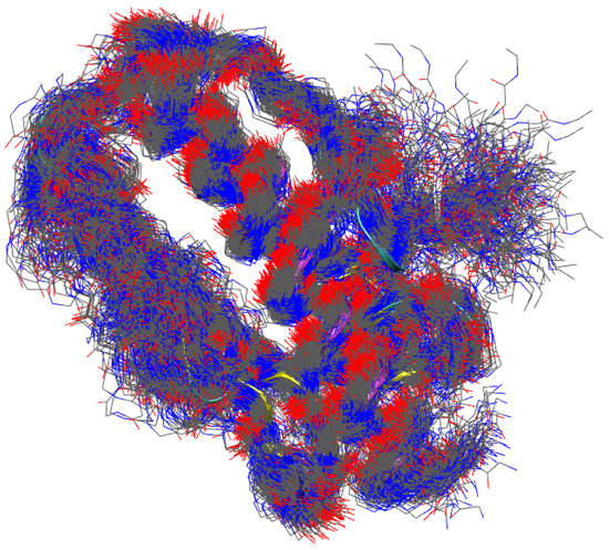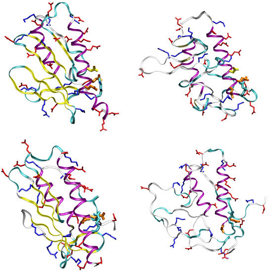 The extent of unfolding will be analyzed in more detail below, by comparing each configuration with the reference folded structures available in the literature. The meta-statistics, that we recall is obtained with no bias reweighting, Equation (2), looks a reasonable reference meta-statistics for all sequences, because it is only slightly dependent on the sequence itself. In all cases, the interactions responsible for either the folding and unfolding of the protein variants are sampled with similar weight. As a representative unfolded configuration, in Figure 3 we display the secondary structure (colored ribbon) and the position of the mutated residues (in green) for a configuration with = 13, = 6.6, and = 2. It can be noticed that the two -helices are only slightly changed in length, but, because of the unfolding of the -sheet scaffold, the two helices change the relative orientation.
