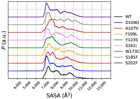 Distribution of solvent-accessible surface area (SASA) obtained in meta-statistics for all studied variants. The order is the same as for Figure 2.