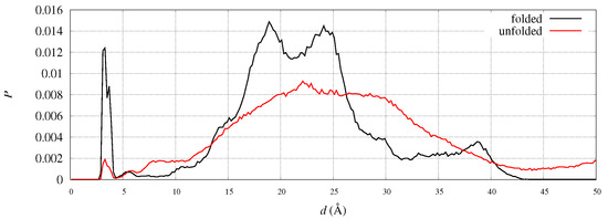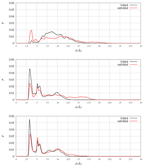 Distribution of selected distances in folded (CV = 14, black curve) and unfolded (CV = 4, red curve) states. Top—d is the distance between N(Arg 97) and C(Asp 104), WT sequence; middle—d is the distance between N(Arg 97) and C(Glu 100-101), WT sequence; bottom—same as in the middle, for D104G variant.
