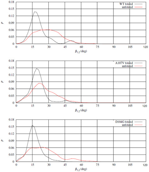 Distribution of the angle between long axes of 1 and 2 segments () in folded (CV = 14, black curve) and unfolded (CV = 4, red curve) states. Top—WT sequence; middle—A107V variant; bottom—D104G variant.