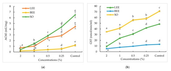 Detoxification enzymes such as GST, cytochrome P450 monooxygenases, and carboxyl/cholinesterases are well-known for helping plant-feeding insects to maintain their physiological roles by detoxifying xenobiotic substances [,]. Pesticides and poisonous secondary metabolites from host plants are examples of xenobiotic substances []. The plant extracts/fractions/essential oils have a variety of modes of action against insects, including neurotoxicity, insect growth/digestive enzyme inhibition, and inhibition of GST and cytochrome P450 monooxygenase []. The AChE activities in A. craccivora fed with bean leaf discs treated with different concentrations of LEE, BEE, and SO showed significant inhibition compared to control aphids. Present results were confirmed with the findings of Dolma et al. [], who reported that Tagetes minuta oil showed an inhibitory effect on AChE in P. xylostella. In a similar study, essential oils and synthesized nano-emulsions from Basilicum ocimum L., Cuminum cyminum L., Origanum marjorana L., and Matricaria chamomilla L. showed decreased activity of AChE in A. craccivora []. Similarly, for the GST assay, all the concentrations of LEE, BEE, and SO significantly inhibited the GST activity as compared to the control. Results conform with the findings of Phankaen et al. [], who reported that caffeine from Coffea arabica extract inhibits GST and carboxylesterase (CarE) in Tribolium castaneum. Similarly, a previous study also showed that Tagetes minuta oil inhibited GST in P. xylostella [].