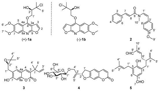 Thirty-seven compounds were isolated and identified from C. lenis and five of them are new ones (1–5). The structures were elucidated based on MS, UV, IR, and NMR spectroscopic data and comparison with the data reported in literature. The absolute configurations of new compounds were characterized by using the ECD calculations and single-crystal X-ray diffraction analysis. (±)-Claulenine A (1) is a chlorine-containing furoquinoline racemate. Chlorinated natural products are rare in terrestrial plants, but common in bacteria, marine animals, and macroalgae [67,68]. 1 could be an artifact produced in the isolation procedure, but could also be generated by Fe(II)- and 2-oxoglutarate-dependent halogenases (2ODHs) [69]. The LC/MS analysis of the fresh C. lenis proved 1 to be originated from a natural source, but the real chlorine source is not clear. Claulenine B (2) is a high conjugated amide alkaloid. Claulenin A (3) is a prenylated coumarin with an oxirane ring and clauleside A (4) is a furocoumarin glucoside. Claulenin B (5) is a p-hydroxybenzaldehyde with multi-prenyl substituents. Of the known compounds, 20 and 38 are the first reported natural products, and 20 and 28 compounds are obtained from Clausena species and C. lenis, respectively, for the first time. Most of these compounds are prenylated, so the prenyltransferases play an important role in their biosyntheses.