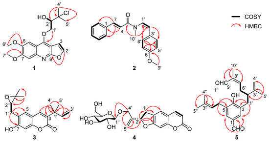 Key HMBC correlations of compounds 1−5.