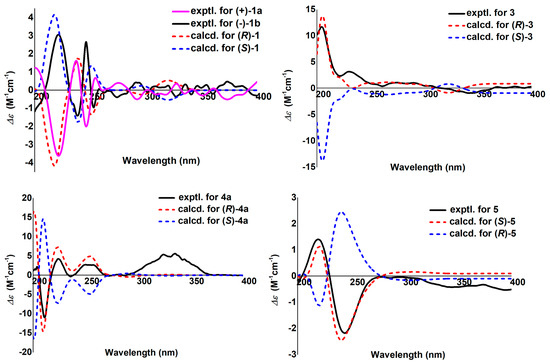 Experimental and calculated ECD spectra of 1, 3, 4a, and 5.