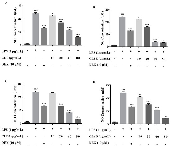 The production of NO stimulated by LPS in BV-2 cells. (A) Inhibitory effects of CLT on LPS-induced NO production in BV-2 cells. (B) Inhibitory effects of CLPE on LPS-induced NO production in BV-2 cells. (C) Inhibitory effects of CLEA on LPS-induced NO production in BV-2 cells. (D) Inhibitory effects of CLnB on LPS-induced NO production in BV-2 cells. Data were presented as the mean ± SD of three independent experiments. ### p < 0.001 versus control group, * p < 0.05, ** p < 0.01, *** p < 0.001 versus LPS group. (CLT: the 95% and 50% ethanol total extract of C. lenis; CLPE: petroleum ether extract of C. lenis; CLEA: ethyl acetate extract of C. lenis; CLnB: n-BuOH extract of C. lenis; DEX: dexamethasone, as the positive control).