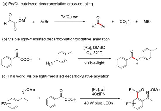 - Fang, P.; Li, M.; Ge, H. Room temperature palladium-catalyzed decarboxylative ortho-acylation of acetanilides with α-oxocarboxylic acids. J. Am. Chem. Soc. 2010, 132, 11898–11899. [Google Scholar] [CrossRef]
