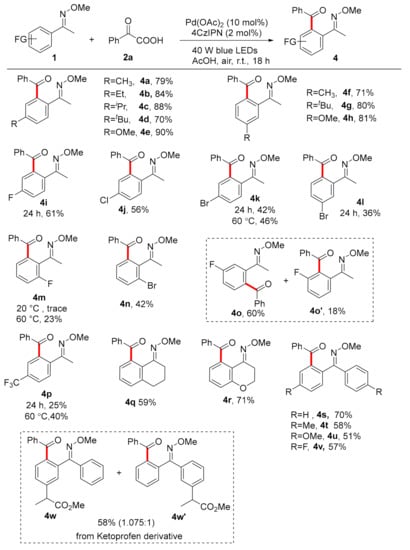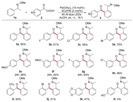 - Lee, P.Y.; Liang, P.; Yu, W.Y. Pd(II)-Catalyzed Direct ortho-C-H Acylation of Aromatic Ketones by Oxidative Decarboxylation of alpha-Oxocarboxylic Acids. Org. Lett. 2017, 19, 2082–2085. [Google Scholar] [CrossRef]