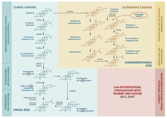 The molecular cascades involve about 15 enzymes [8]. In the classical cascade, the initial stages take place in the cytoplasm and endoplasmic reticulum. In the first step, cholesterol is converted to 7α-hydroxycholesterol by cholesterol-7α-hydroxylase (CYP7A1).