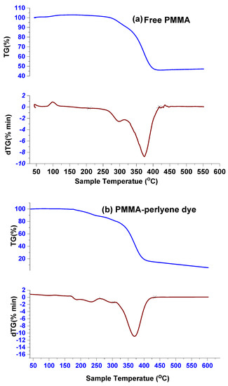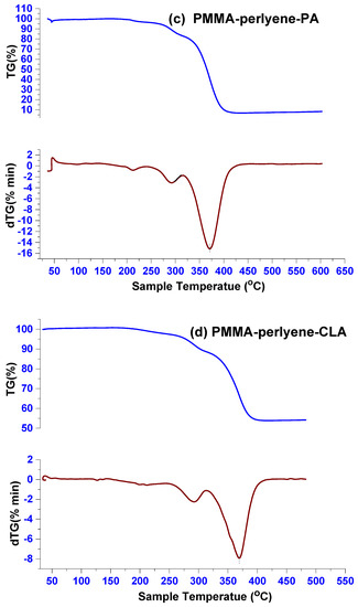 Figure 2a–d illustrate the degradation of free PMMA, PMMA-perylene dye, PMMA-perylene-PA, and PMMA-perylene-CLA polymeric sheets during thermal decomposition. The obtained data from the TG method show that one to three different stages of fragments. The PMMA polymer sheet (Figure 2a) has only an intense broad band within the temperature range 252–419 °C, which is supported by the maximum dTG peak at 374 °C, accompanied by additional weight loss of 52.65% that can be attributed to the evolution of the carbon dioxide gaseous phase, and few unoxidized carbon atoms are formed as a residual product. In the case of polymer sheets consisting of perylene dye in in situ PMMA (Figure 2b), the first thermal decomposition step is assigned to the decomposition of perylene dye, attributed to the small endothermic dTG at 231 °C and weight loss (found = 10.811%) detectable in the 167–261 °C temperature range. The second thermal degradation stage is due to the decomposition of PMMA, which, displayed in the broad endothermic peak with experimental mass loss, is 82.465% in the 310–429 °C temperature range with dTG peaks at 370 °C. The residual mass is equal to 6.724%, which is attributed to the unoxidized few carbon atoms. Regarding the thermal decomposition of the two PMMA-perylene-PA and PMMA-perylene-CLA polymer sheets (Figure 2c,d), they have three stages at first (193–240 °C), second (243–315 °C), and third (317–435 °C) and first (114–134 °C), second (248–318 °C), and 3rd (319–419 °C) with the dTG peaks at 212, 291, and 371 °C and 121, 294, and 374 °C, respectively. The thermal decomposition steps in the N2 environment pass through three species as donor (perylene dye), acceptor (PA or CLA), and PMMA decompositions and the residual product is un-oxidized free carbon atoms. These thermal decomposition steps have a weight loss that changes with various thermodynamic behaviors [18]. A substantially broad endothermic peak with a mass loss shown at the temperature range of 317–435 °C to be 88.183% and 43.377% for PMMA-perylene-PA, and PMMA-perylene-CLA polymer sheets, respectively, can be attributed to the acceptors and PMMA species and residual unoxidized carbon atom formation. The observed difference between mass loss curves of PMMA-perylene-PA and PMMA-perylene-CLA polymer sheets is related to the difference in the molecular formula of acceptor that the PA acceptor has a rich amount of oxygen atoms allowed to facilitate the oxidizing of free carbon atoms. The thermal analysis of the PMMA-perylene-iodine polymer sheet was not performed because the polymer sheet contains iodine, as iodine has sublimation properties, which does not give accurate thermal cracking values.
