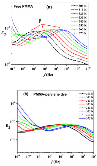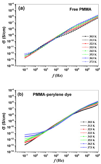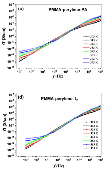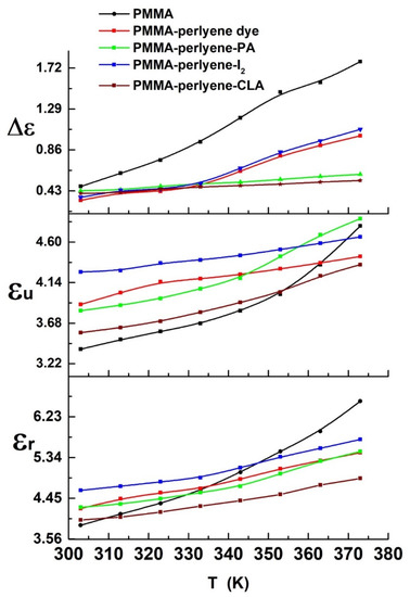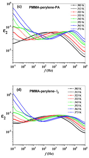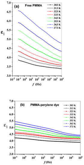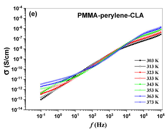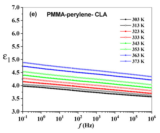 The baseline of without the contribution of free charge migration and dipole orientation can be obtained from unrelaxed (, which is identified as the plateau reached in at high frequencies when all polarization fluctuations due to orientation polarization cease. The decrease in with increasing frequency can be described based on several types of polarization (orientation, and electronic). All types of polarizations may be effective in low frequencies. However, at higher frequencies, the may be quite small because some polarization types may not be effective. Temperature dependency and the contribution of the different types of polarizations may not be same. Additionally, the higher degree of dipole orientation in the polymeric sheets can be obtained from the relaxed permittivity or static permittivity ( The oscillator or dielectric strength () of the polymeric sheets can be describes from the relation, . The dielectric strength of the polymer provides information about the voltage that the synthesized polymeric sheet can withstand before breakdown occurs [27]. In addition, the dielectric strength of the synthesized polymeric sheet represents the effective moment of the orienting unit increases with a temperature increase on the whole, in which certain units of the chain are gradually motivated with increasing temperature, and the dielectric polarization is enhanced. The dielectric relaxation time is gradually decreased with increasing temperature. This is evidence that the response time of the polymeric chain polarization is progressively harmonious with the alternative electric field [28]. The temperature dependence of , of the synthesized polymeric sheets are shown in Figure 4. At higher frequencies, electric dipoles are unable to follow the fast variations in the AC field, resulting in low values of . At low frequencies, higher values of were observed as a result of the electric dipoles responding faster with the AC field. In addition, space charge polarization occurred due to presence of different boundary regions and a difference in conductivity, so dielectric constant increases with the increment of temperature [29,30,31]. Moreover, at 303 K, Figure 4 shows that the has a value of 3.42, 3.91, 3.87, 4.28 and 3.62; has a value of 3.86, 4.22, 4.25, 4.62 and 3.97; and the has a value of 0.44, 0.31, 0.38, 0.34 and 0.35 for free PMMA, PMMA-perylene dye, PMMA-perylene-PA, and PMMA-perylene-CLA, respectively.