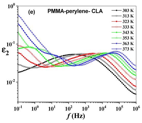Electric permittivity is the furthermost meaningful and common demonstration of the dielectric data in polymers. The energy storage ability of the polymer can be shown by the real part of the dielectric permittivity (). Alternatively, the energy dissipation (absorption of the polymer) due entirely to the material medium can be shown by the imaginary component (). For the synthesized polymeric sheets, the frequency dependences of and were obtained at a temperature range of 303–373 K and over a frequency ranging between 0.1 Hz and 1 MHz. The frequency and temperature dependences of for the polymeric sheets are shown in Figure 3a–e. An increase inwith decreasing frequency over the investigated temperature range (dispersion of) was observed. Alternatively, at constant frequency, a decrease inwith decreasing temperature (the mobility of polar molecules increases) was observed.