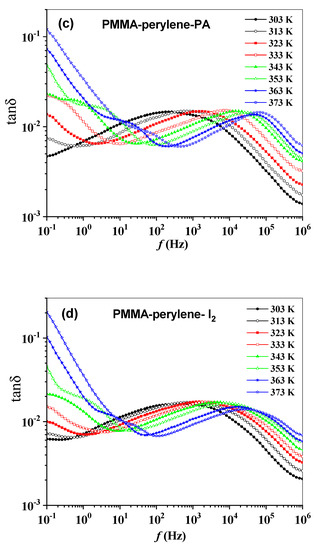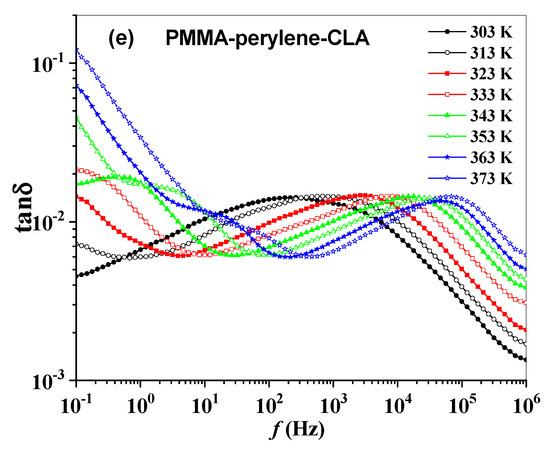 For many electrical engineering applications, the loss tangent or so-called dissipation factor) is also frequently used to describe the amount of energy dissipated inside the polymer due to the alternative field. It is an amount of polymer polarization inertia with respect to the applied electric stimulus. The tan δ can be used to demonstrate a dielectric of polymer in cases where the geometry of the polymer is not known. The frequency and temperature dependences of for the polymeric sheets are shown in Figure 6a–e. The loss tangent at lower frequencies is related to the loss of the interfacial polarization, while the loss tangent at higher frequencies is related to the change in dipole-relaxational polarization [36].