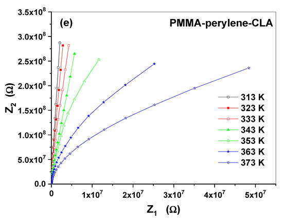 (a–e): The complex impedance plot of the synthesized polymeric sheets at different temperatures.