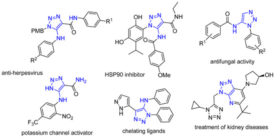 Nitrogen containing heterocycles, in particular five-membered azole systems, are common structural elements of many natural and synthetic biological active compounds. They serve as universal scaffolds for creating new organic molecules with set properties especially for the needs of biomolecular and medicinal chemistry as well as for materials science [1,2,3,4,5,6]. In the last few decades fully substituted and variously functionalized 1,2,3-triazoles, whose structure fragment is not found in nature, became one of the most interesting and widely used class of compounds due to their unique physicochemical properties and synthetic accessibility [7,8]. These compounds possess remarkable thermal and metabolic stability, large dipole moment, and capability for H-bond formation making them effective peptide bond isosteres [9,10,11] that result in a variety of applications in diverse fields of chemistry [12,13,14,15,16,17,18,19,20]. Among fully substituted 1,2,3-triazoles special attention is focused on 5-amino-1,2,3-triazoles and their 5-arylamino derivatives, which exhibit very promising biological properties such as antiviral, antifungal, antiproliferative and antimetastatic activities. They also serve as activators of potassium channel andchelating agents and have a potential for treating inflammatory kidney diseases (Figure 1) [21,22,23,24,25,26].