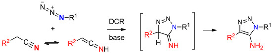 Since the pioneering Dimroth works published in the beginning of the 20th century [27,28], keteniminate-mediated 1,3-dipolar cycloaddition (DCR) of organic azides with nitriles bearing an active methylene group provide one of the most efficient and straightforward methods to access to the 5-amino-1,2,3-triazole synthesis up to date (Scheme 1) [29,30,31,32].