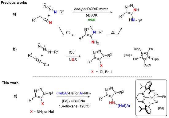 We have recently developed effective methods for obtaining 5-amino- [47] and 5-halo-1,2,3-triazoles [48] via one pot azide-nitrile cycloaddition/Dimroth rearrangement (Scheme 2a) and Cu(I)-catalyzed [3+2] cycloaddition reaction of Cu(I)-acetylide and aryl azides with subsequent Cu-triazolide halogenation (Scheme 2b). Based on our experience in Pd-catalyzed cross-couplings of hetaryl halides [49,50,51,52] and halo-1,2,3-triazoles [53,54] we would like to provide details of an efficient route to N-arylamino-1,2,3- triazoles using the Buchwald–Hartwig reaction of 5-amino or 5-halo-1,2,3-triazoles (Scheme 2c).