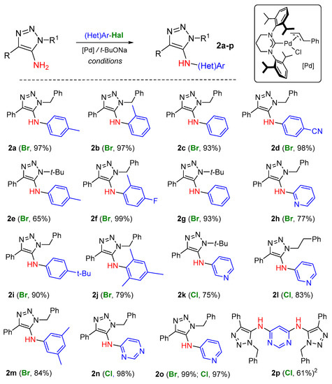 We commenced our investigation with the reaction between 1-benzyl-4-phenyl-1,2,3-triazole-5-amine and 1-bromo-4-methylbenzene to screen for optimal conditions for the cross-coupling (Table 1). A series of palladium complexes with expanded-ring NHC ligands (Figure 3) were initially tested as they proved to be competent catalysts for Buchwald–Hartwig amination of (het)aryl halides with primary aryl amines [50,51]. We found that the reaction performed in the presence of 1.0 mol% (THP-Dipp)Pd(cinn)Cl and 1.2 equiv. of sodium tert-butoxide in 1,4-dioxane at 120 °C for 24 h yielded the desired 5-(p-tolyl)amino-1,2,3-triazole 2a in 53% yield (Table 1, entry 1). The reaction did not reveal the full conversion of the starting materials (TLC and 1H NMR analysis). The prolonged reaction time did not result in a better yield of the product. The increase of the Pd-catalyst loading up to 2 mol% and the base up to 3.0 equiv. almost led to quantitative formation of 2a (entry 3). Other NHC-Pd complexes with allyl and metallyl ligands exhibited slightly less activity under tested conditions (entries 4, 5). The traditional Pd(OAc)2/phosphine-based catalytic systems [55] were also tested, exhibiting insufficient activity for the process (entries 6–9).