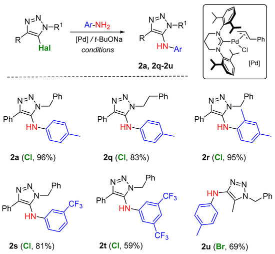 Then, we studied the reversed variant of the Buchwald–Hartwig cross-coupling reaction, namely the interaction of 5-halo-1,2,3-triazoles with aryl amines. Fortunately, we found that the conditions for aminotriazole—aryl halide coupling proved to also be suitable for the combination of halotriazole—aryl amine. Thus, corresponding derivatives of 5-arylamino-1,2,3-triazole such as N-(p-tolylamino) (2a, 2q) and N-(2,4-dimethylamino) (2r) triazoles were obtained in good to excellent yields. Arylamines with electron-withdrawing CF3 group(s) in aromatic ring (2s and 2t) can also be successfully used for this reaction. Example 2u demonstrates that the method is also applicable for the preparation of 4-(N-arylamino)-1,2,3-triazoles from the corresponding 4-halo-1,2,3-triazoles, while their synthesis was previously described via coupling of 4-amino-1,2,3-triazoles [46] (Scheme 4).
