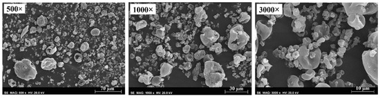 Some loss occurred at the internal walls of the precipitator chamber, possibly due to the typical static electricity following spray drying. This may have also been one of the factors affecting process yields. Physicochemical properties of the HPC microparticles appear in Table S2 (Supplementary Materials). Formulations with lower solid content were found to yield more homogeneous particle size distributions (lower span values). Morphologi G3 images also (Figure S2, Supplementary Materials) revealed good particle dispersion. At higher magnifications, some larger particles appeared to be aggregates of two or three particles. The DPF SEM images with the higher solid concentration in Figure 1 show that the microparticles appeared to be irregularly shaped yet slightly smooth, with the larger particles becoming more rounded.