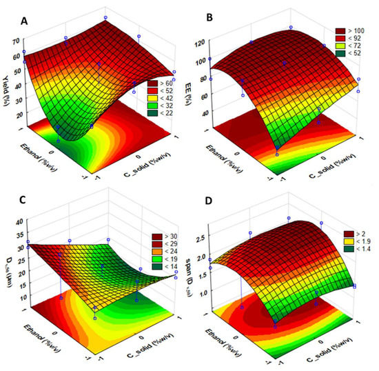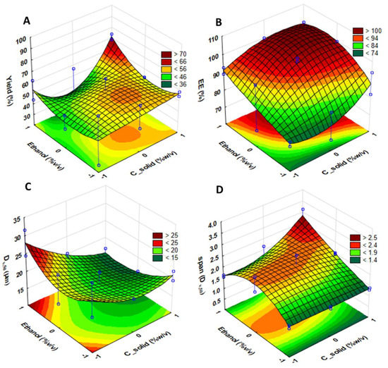 In order to investigate the effect of each RSV–DPF (potential critical process parameters) on the critical quality attributes under study (process yield, encapsulation efficiency (EE), particle size (Dv,50) and span), response surfaces for each variable were obtained using ANOVA (Figure 2).