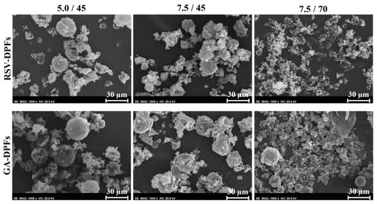 Figure 4 displays the morphology of the SASD-processed microparticles of RSV–DPFs and GA–DPFs (Figure 4) where broad particle size distribution and particle agglomerates for all0 three powders appear. These have a wrinkled surface analogous to HPC processed microparticles from the preliminary studies. This may be a result of the rapid solvent evaporation during decompressive atomization. Agglomerates may form as a result of HPC electrostatic and van der Waals forces due to high carbohydrate content. Smaller microparticles present rounded, irregular shapes while larger ones are spherical and smoother. For both 7.5 %w/v RSV–DPFs and GA–DPFs microparticles, increasing ethanol concentration from 45 to 70 %v/v decreases particle size distribution. No significant differences were observed for size distribution, only for solid concentration, as confirmed both by variance analysis and size and particle distribution.
